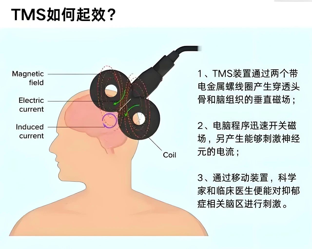 重复经颅磁刺激(rTMS):每天10分钟刺激左侧前额叶,相当于0.5片舍曲林的抗抑郁效果[3]